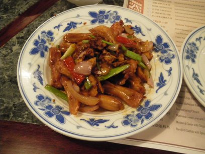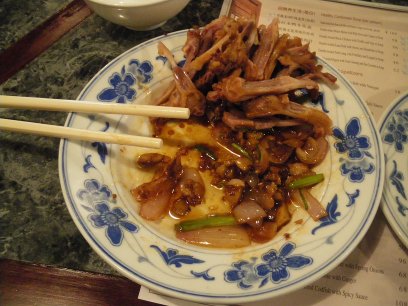 John's appetizer -- a bowl of about 25 goose tongues with a ginger sauce. We also had roasted goose, barbequed pork ribs and steamed mushroom, fungus, zucchini and soybean sprouts.