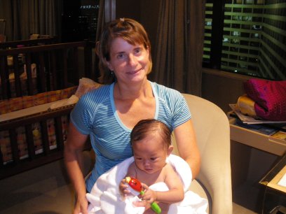 We're at the end of our last full day in China. This morning we did a little shopping in a 6-story mall full of very small shops of everyting from hair clips to fine china. We said our good byes to 3 families in the group this afternoon and then this evening to one other family who is leaving early tomorrow morning. We then did some emergency shopping at the Friendship Store as we were down to our last wipe and we probably didn't have enough formula or diapers to get back to St. Louis and needed some ZipLoc bags (aka, toxic waste bags) for the flight back. For dinner we went to a Cantonese restaurant here in the hotel. Tomorrow we'll take it easy and probably lounge around the hotel. We leave the hotel at 4:30pm, and our flight leaves Guangzhou at 9pm our time, so hopefully we'll be boarding around 8pm, just in time for Nealy to go to sleep. Next stop: Los Angeles! Can't wait to see everyone, for everyone to meet Nealy and for Nealy to meet everyone... and can't wait for water not needing to be boiled before drinking, cooler/dryer weather (have we mentioned it's very hot and very humid here?), and no need to dig through the luggage to find everything.
